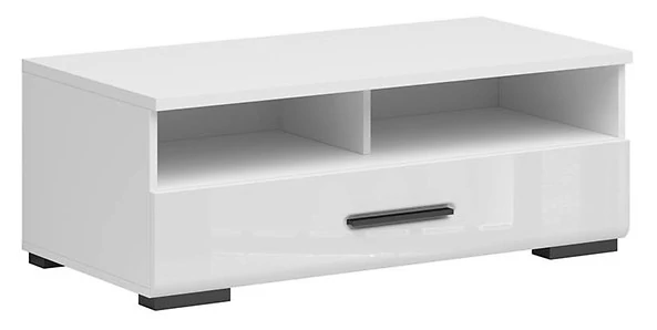 A fehér korpusz és a magasfényű fehér front tökéletes összhangban van egymással, letisztult megjelenést teremtve, míg a fekete fogantyú elegáns kontraszot képez a korpusz színével. A fiók önvisszahúzó tehnikával van ellátva, mely biztosítja a csendes záródást. Az elrendezés egy fiókból és két nyitott fakkból áll, amelyek kiváló lehetőséget nyújtanak kiegészítők vagy dekorációk elhelyezésére.