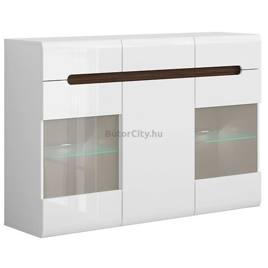 Az Azteca Trio vitrines komód egy elegáns szekrény, ami a modern stílusú nappaliknak tökéletes kiegészítő eleme lehet. A letisztult hatású magasfényű fehér MDF frontot kifinomult üveges résszel egészítették ki. A bútoron lévő dekorcsík háromféle színben érhető el, melyeket a csomag mind tartalmazza, így elég a komód összeszerelésekor eldönteni, melyik tetszik legjobban. A három fiók és a polcos részek rengeteg tárolóhelyet kínálnak a bútor használata során. A komód webáruházunkban pár kattintással megrendelhető.