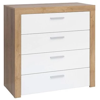 A modern és letisztult stílust képviselő Balder bútorcsalád tagja a Balder fiókos komód, mely praktikusan 4 fiókot tartalmaz. Mivel nem olyan széles, kisebb helyekre is kényelmesen elfér. Eleganciáját a riviera tölgy színnel kombinált magasfényű fehér front adja, mely manapság igencsak divatos - nem véletlenül.