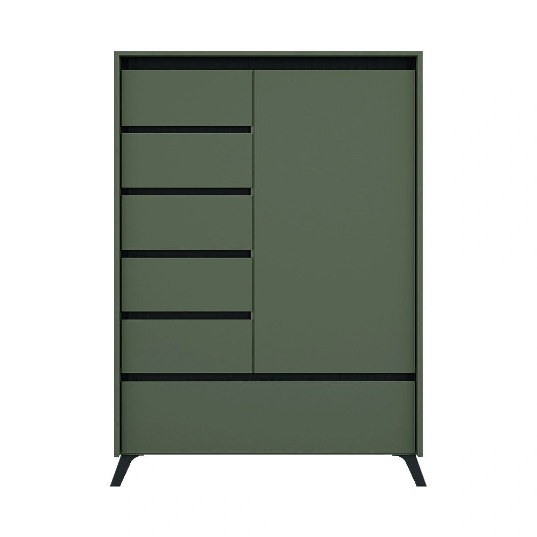 - Elrendezés: 5 fiók, 1 nagy ajtó és 1 lenyíló ajtó (az alsó)