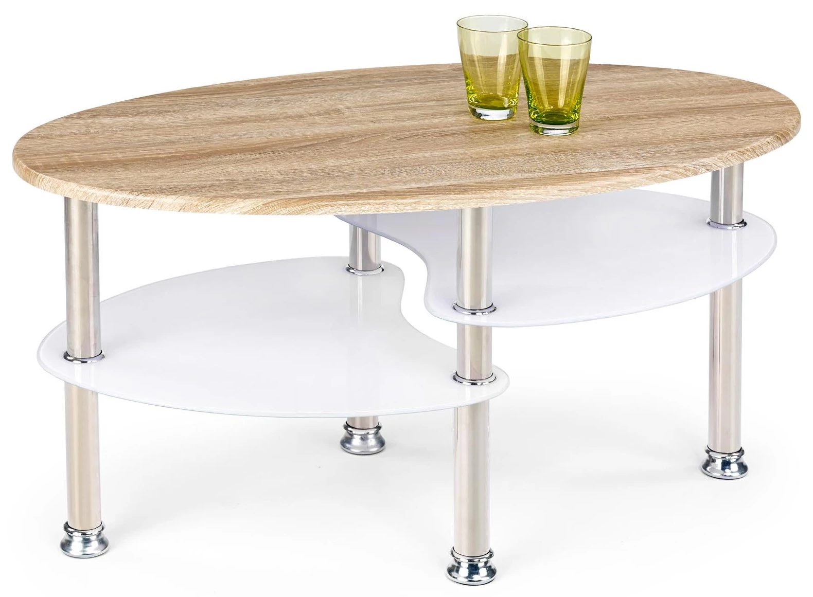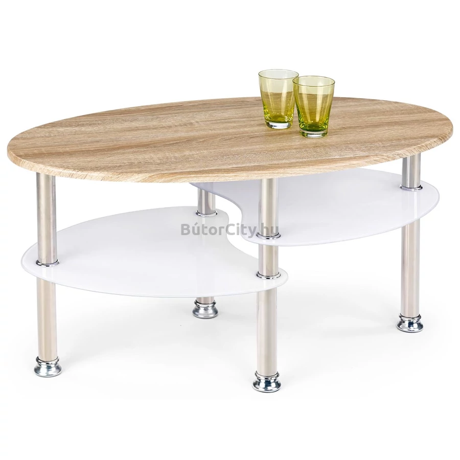 Közkedvelt összeállítású, üveg és fa hatású lapok kombinációja króm színnel.  A tetőlap sonoma tölgy színű, az alsó üveglapok fehér üvegek.