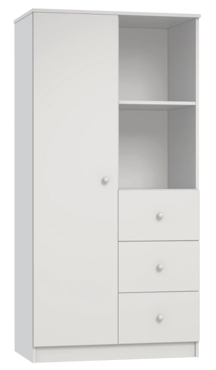 Minden gyermekszobában kell egy nagyobb méretű szekrény, ahová a ruhákat pakolhatjuk. A fehér színű Mia nagyszekrény egyajtós, háromfiókos és két nyitott fakkos elrendezése elegendő tárolóhelyet ad majd a bútor használata során. Az ajtó mögötti részen kettő darab akasztórúd található, de igény esetén három darabból álló polc szett is rendelhető hozzá. A rendeléskor további extrákat is kérhetünk, ilyen például az ütközés csillapító és a fiókbehúzó. Rendelj szekrényt gyermekszobába online! Akár itt a bútor webáruházban.